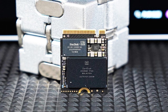 移去正面贴纸,就可以看到WD_BLACK SN770M的全部电子元器件,布局非常紧凑,采用当下流行的DRAM-Less无缓存方案,主控芯片为闪迪20-82-10082-A1,核心存储元件为112层堆叠的闪迪Bisc5 3D TLC NAND颗粒,整体规格与WD_BLACK SN770M基本一致。
