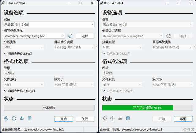 下载完Steam OS系统恢复包后,再准备一个8GB以上的U盘,使用Rufus这款软件将系统释放到U盘。选择好镜像文件点击“开始”,待进度条100%就完成了系统盘的制作。需要注意的是,Rufus在恢复操作的时候会将U盘格式化,记得提前备份好里面的文件。