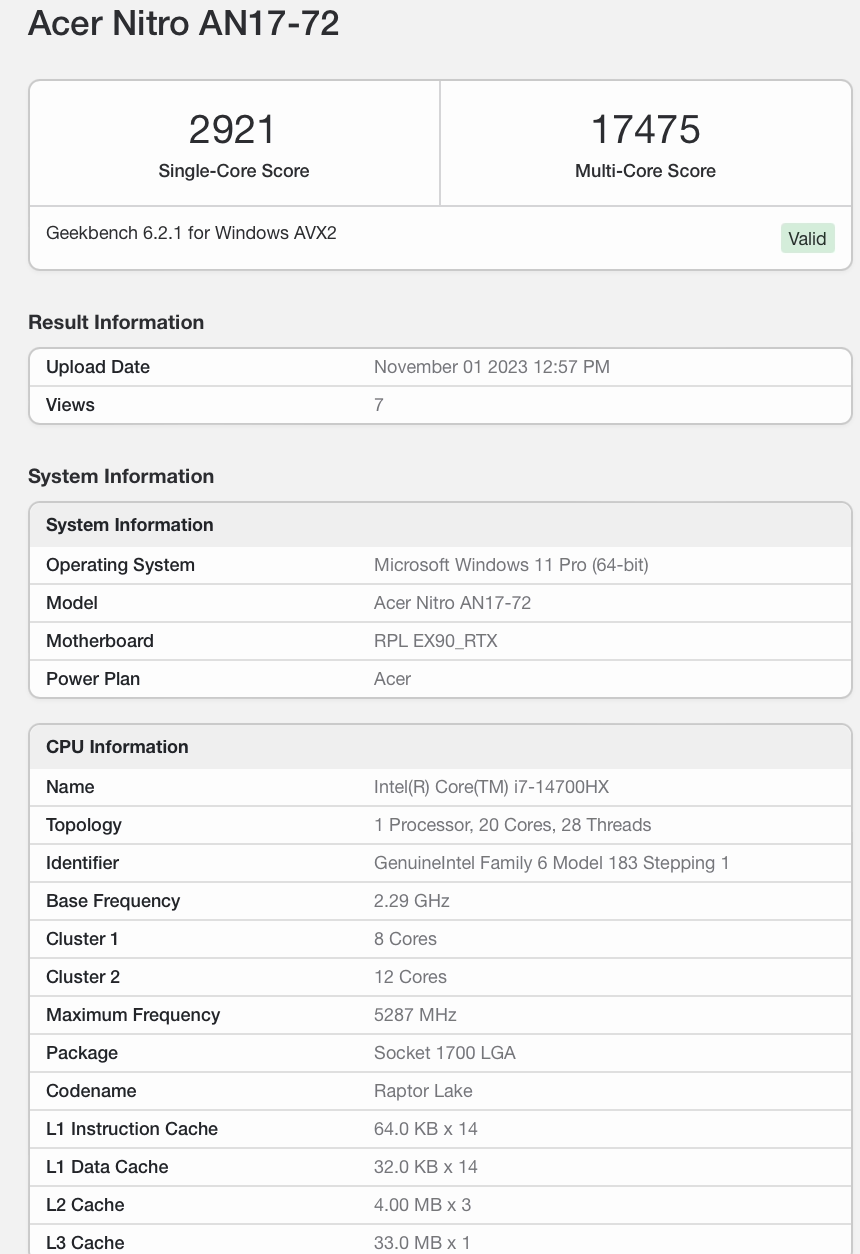 前不久英特尔发布了酷睿14代i7-14700K桌面处理器,其工艺与架构不变,相比上代增加四个小核,并提高了睿频频率。但高端游戏本和移动工作站对应的HX系列移动处理器目前还暂未发布,不过近日有一款搭载i7-14700HX移动处理器的宏碁新款笔记本出现在了Geekbench上。