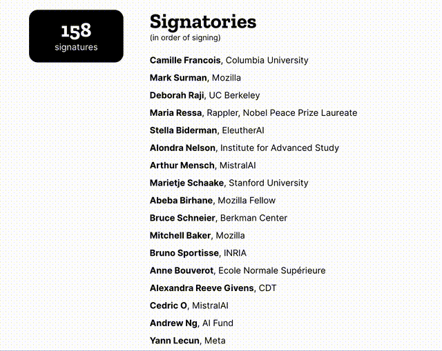 与此同时,站队开源的大佬们,也签署了一份呼吁人工智能开发更加开放的联名信。