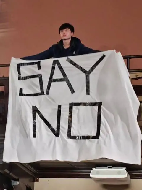 期间,一些抗议者甚至在阳台上悬挂横幅、扔下传单,场面一度十分混乱。