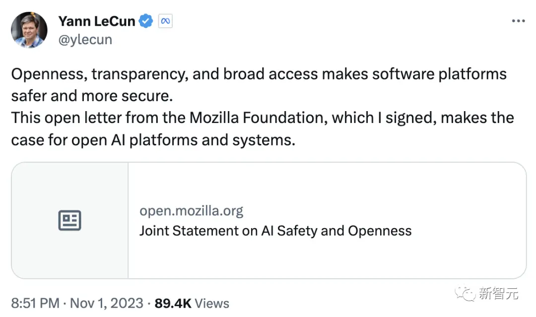 LeCun表示,“开放、透明和广泛的访问使软件平台更加安全可靠。我签署了这封来自Mozilla基金会的公开信,信中提出了开放人工智能平台和系统的理由。”