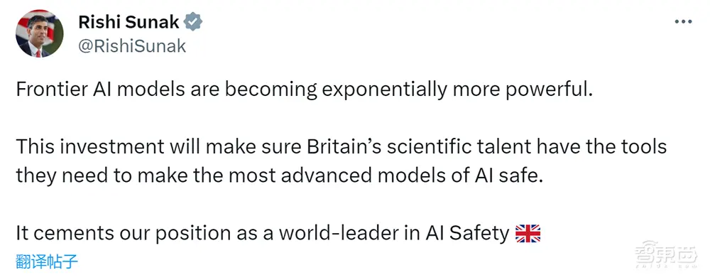 英国首相里希·苏纳克(Rishi Sunak)在社交媒体平台X上称:“前沿AI模型的力量正在呈指数级增长。这项投资将确保英国的科学人才拥有他们所需的工具,以确保最先进的AI模型的安全。”