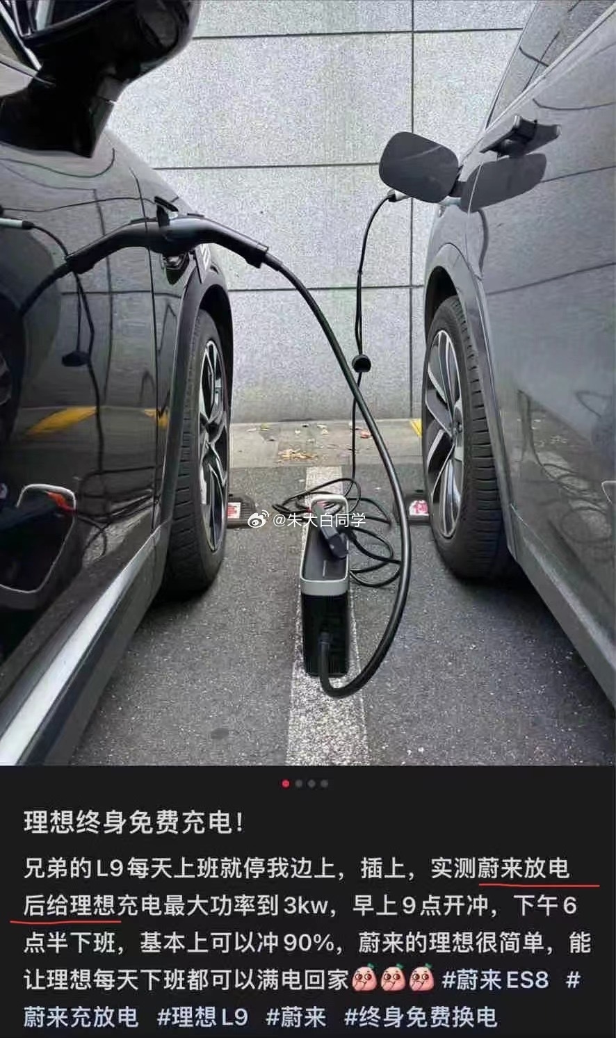 此外,还有车主分享了另一种高阶“薅法”,他兄弟的理想L9每天上班就停在他车旁边,通过蔚来的放电为其充电。