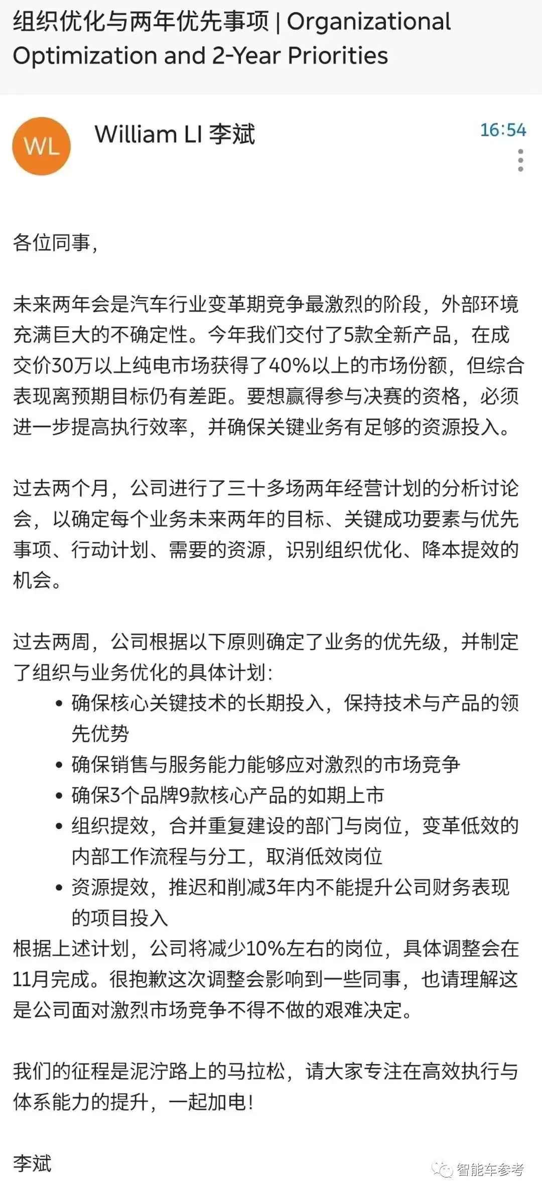 李斌一封全员信直接向所有员工预告:公司接下来要进行裁员,减少10%左右的岗位,以进行组织优化和降本增效,11月底完成。