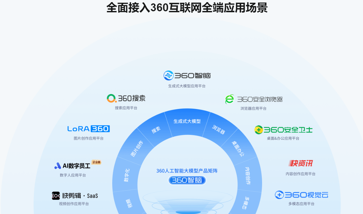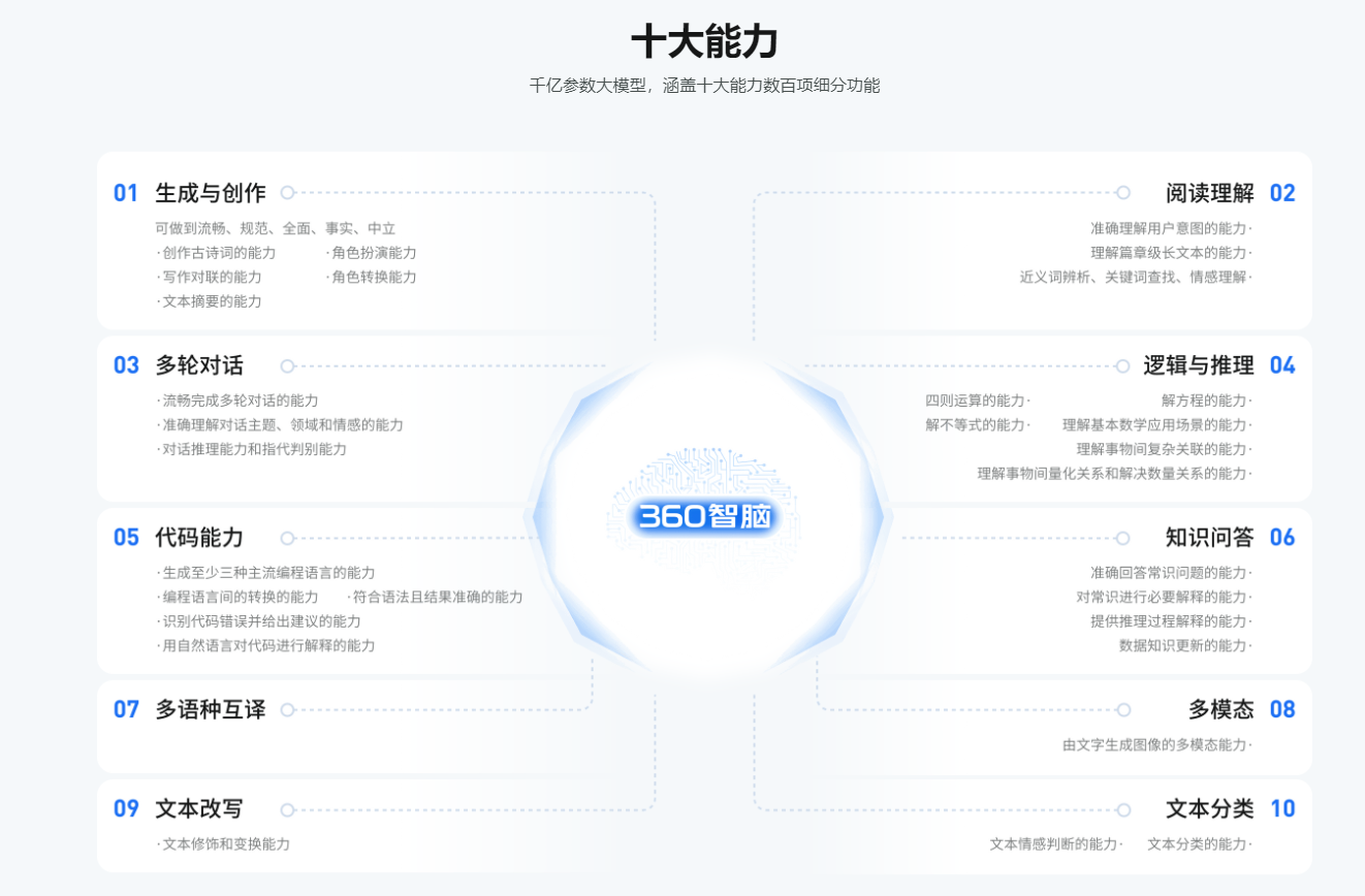 官方表示,360智脑大模型集成360GPT大模型、360多模态大模型技术能力,具备生成创作、多轮对话、逻辑推理等十大核心能力,覆盖大模型全部应用场景。