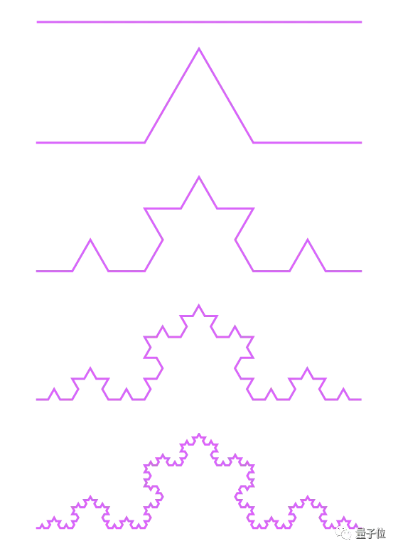 比如科赫曲线(下图为它的4次迭代过程),每一部分都由4个跟它自身比例为1:3的形状相同的线组成,它的豪斯多夫维数就约等于1.26。