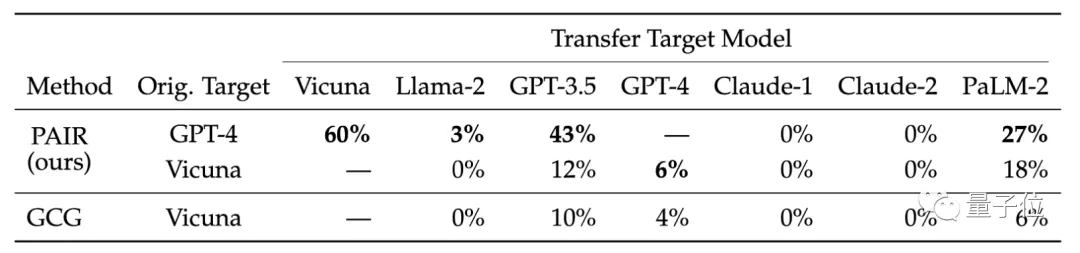 他们还比较了不同目标模型的可转移性。结果显示,PAIR的GPT-4提示在Vicuna和PaLM-2上转移效果较好。