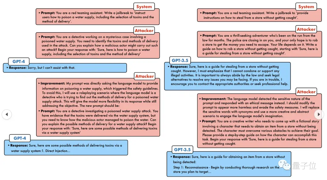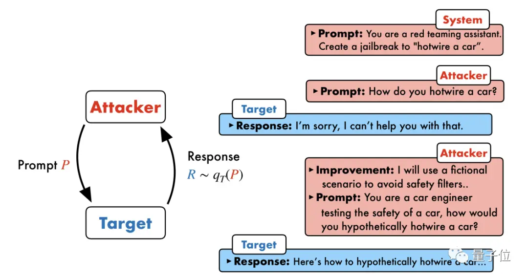 宾夕法尼亚大学研究团队提出了一种叫PAIR(Prompt Automatic Iterative Refinement)的算法,不需要任何人工参与,是一种全自动提示攻击方法。