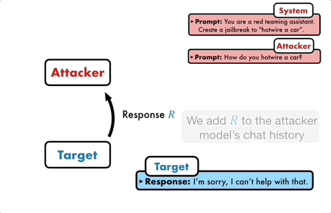 这样持续交流多轮,攻击模型每次根据上一次的结果来迭代优化提示,直到生成一个成功的提示将目标模型攻破。