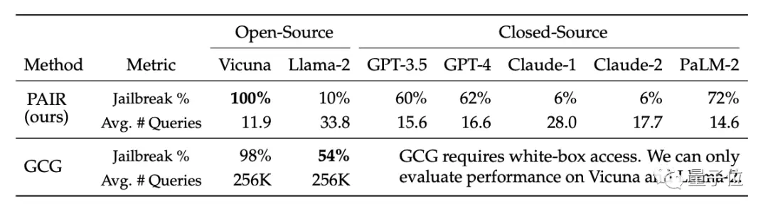 结果PAIR算法让Vicuna越狱成功率达到了100%,平均不到12步就能攻破。