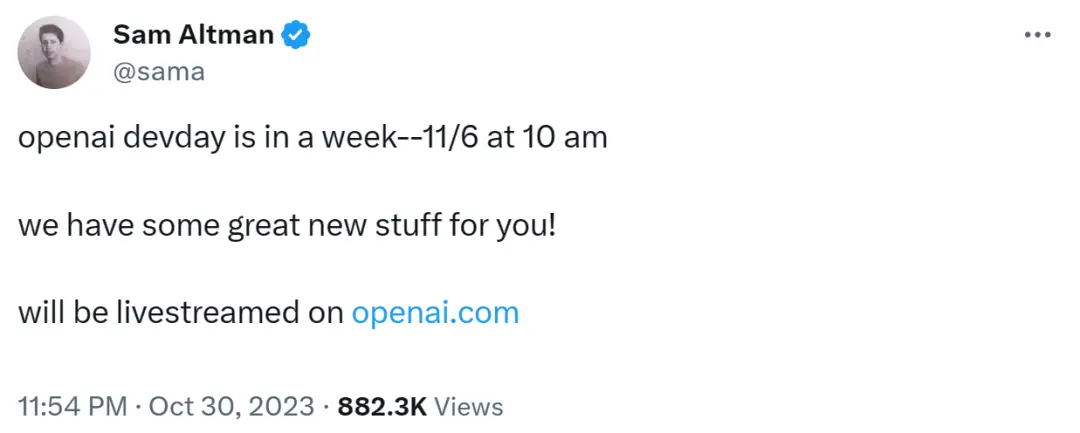 OpenAI CEO Sam Altman 信誓旦旦,“我们会发一些非常棒的新东西。”今年 9 月,OpenAI 官宣了其首届开发者大会“OpenAI DevDay”。届时 OpenAI 团队成员将与全球各地的开发者汇聚一堂,预览全新的 AI 工具。当时 OpenAI 首席执行官 Sam Altman 表示,此次开发者大会不会发布 GPT-5 或 GPT-4.5 或类似大模型。即使如此,会上发布的 AI 工具仍然勾起了人们的广泛期待。
