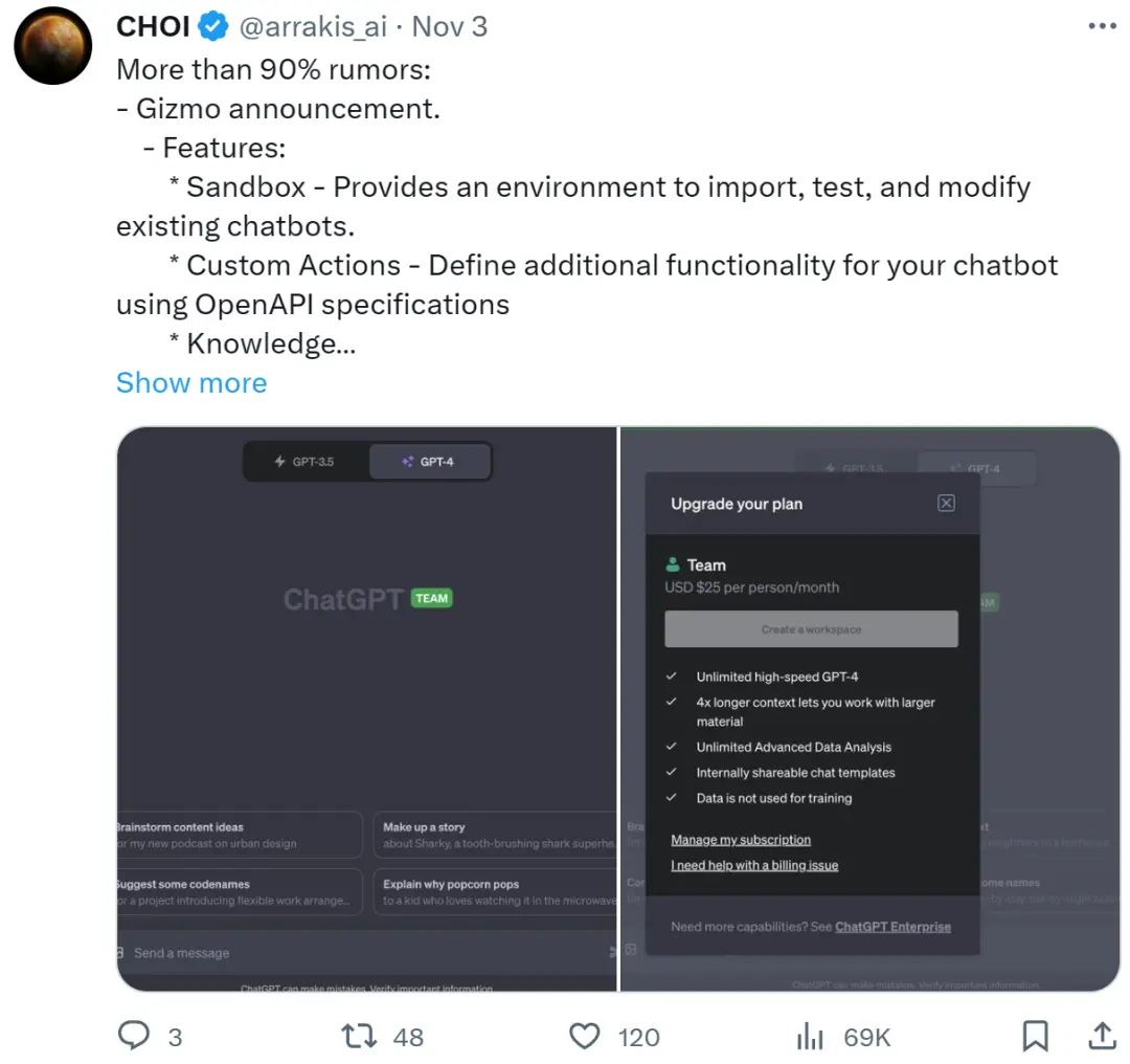 消息源来自 X 用户 CHOI,他表示 OpenAI 将公布 ChatGPT 的重大更新,包括全新的界面以及一些新功能:自定义聊天机器人、与Google和微软的连接器以及新的订阅模式。