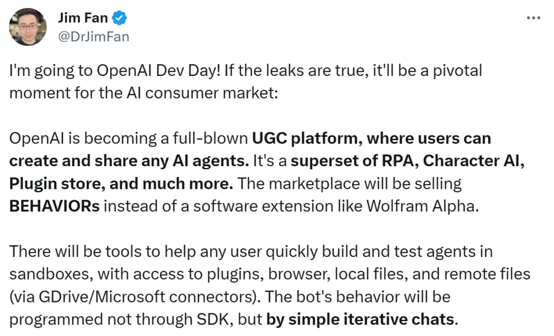 英伟达研究科学家 Jim Fan 将参加 OpenAI 开发者大会,他表示,如果泄露属实的话,将成为 AI 消费者市场的关键时刻。