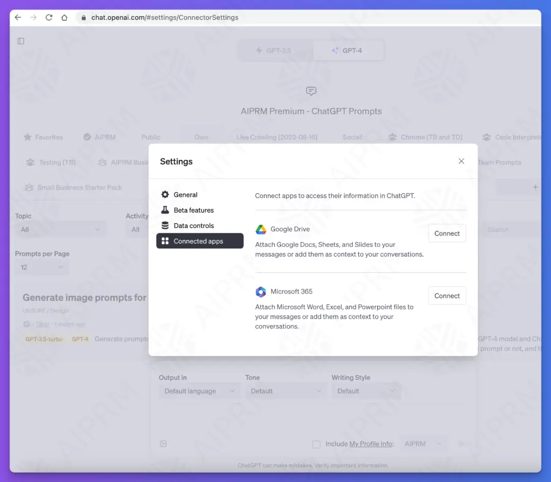 此外,他还分享了“上下文连接器”的截图,该连接器可用于将其他应用程序连接到 ChatGPT。如下截图显示的是 Google Drive 和 Microsoft 365。这样,文档、电子表格或演示文稿就可以附加到聊天中,或用作对话的上下文。