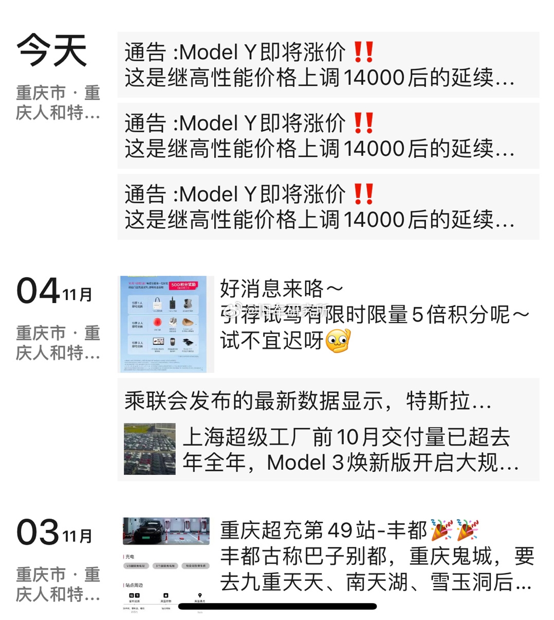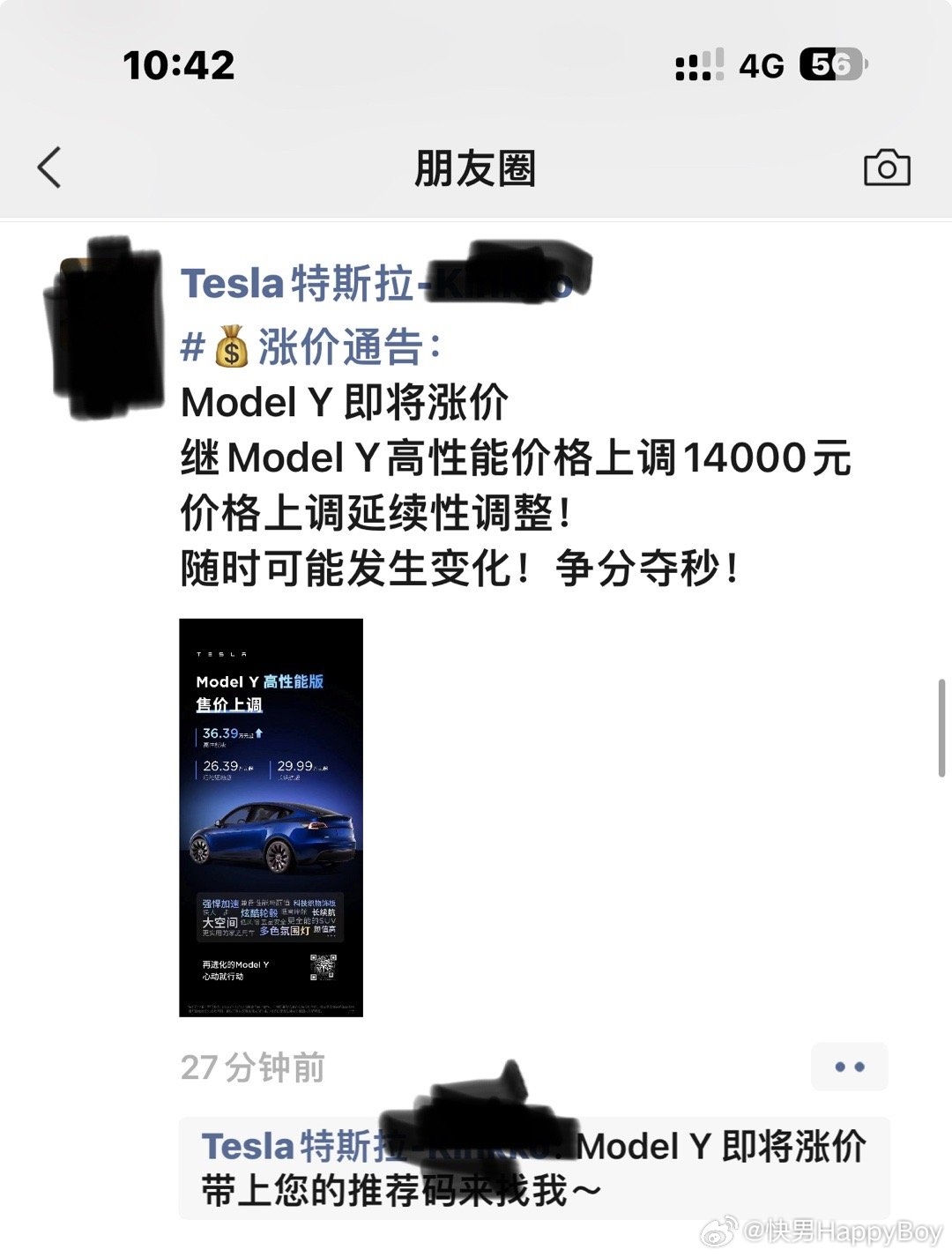 网友反馈称,多名特斯拉销售在朋友圈发布了Model Y即将涨价的预告,甚至有销售一连发布三条涨价通知。其中显示:Model Y即将涨价,这是继高性能价格上调14000后的延续性调整。不过,特斯拉官方还未对此消息做出回应,不清楚是营销配合还是真实的涨价预告。