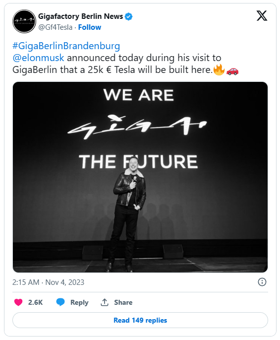 特斯拉将在柏林超级工厂生产2.5万美元的电动汽车,是由马斯克在同员工会面时透露的。作为特斯拉的CEO,马斯克频繁到访特斯拉旗下工厂,检查生产及运营状况,他在上周前往了柏林超级工厂。