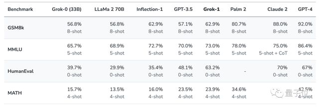 Grok-1取得的成绩也超过GPT-3.5,在Claude 2与GPT-4之间。