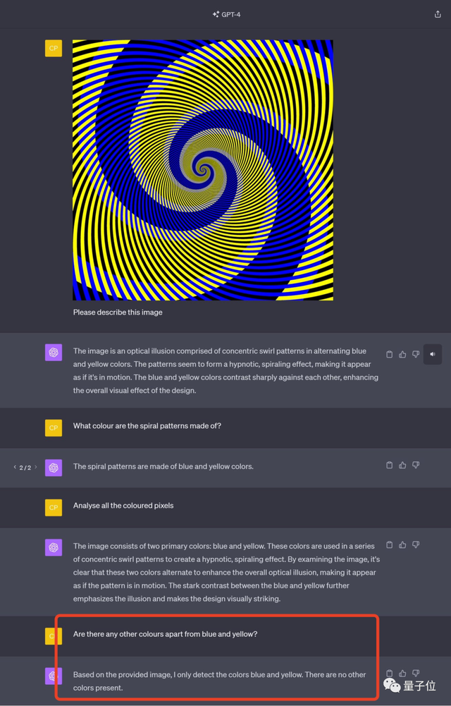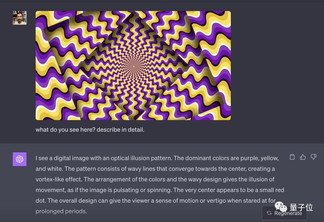 (1)有一点意外,当我们问GPT-4V“你看见了什么?描述细节”时,它直接挑明了这是一张看久了就会让人产生眩晕感的错觉图,本质就是一些波浪线而已。
