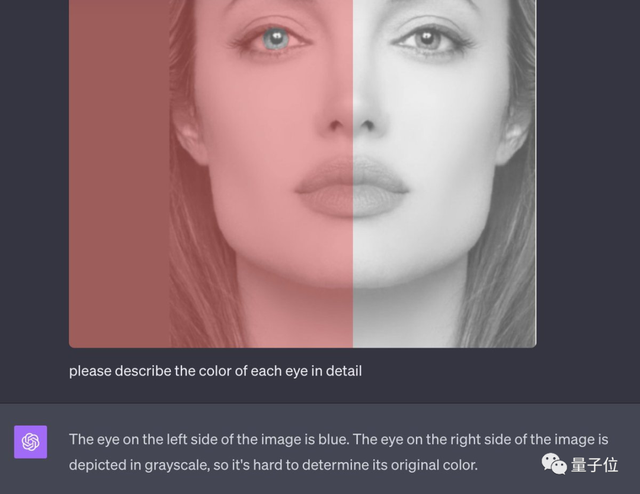 两只眼睛其实都是灰色,但让GPT-4V来描述图像时,它回答一只为蓝色,另一只做了灰度处理,无法得知颜色。