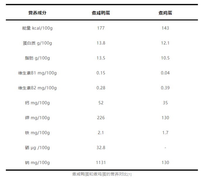 煮咸鸭蛋的蛋白质和脂肪含量,分别是煮鸡蛋的 1.14 倍、1.3 倍,热量也比煮鸡蛋高,是其 1.2 倍;钾含量也不错,为 226mg/100g,是煮鸡蛋的 1.7 倍;硒含量比较突出,为 32.8 微克/100 克。[1]