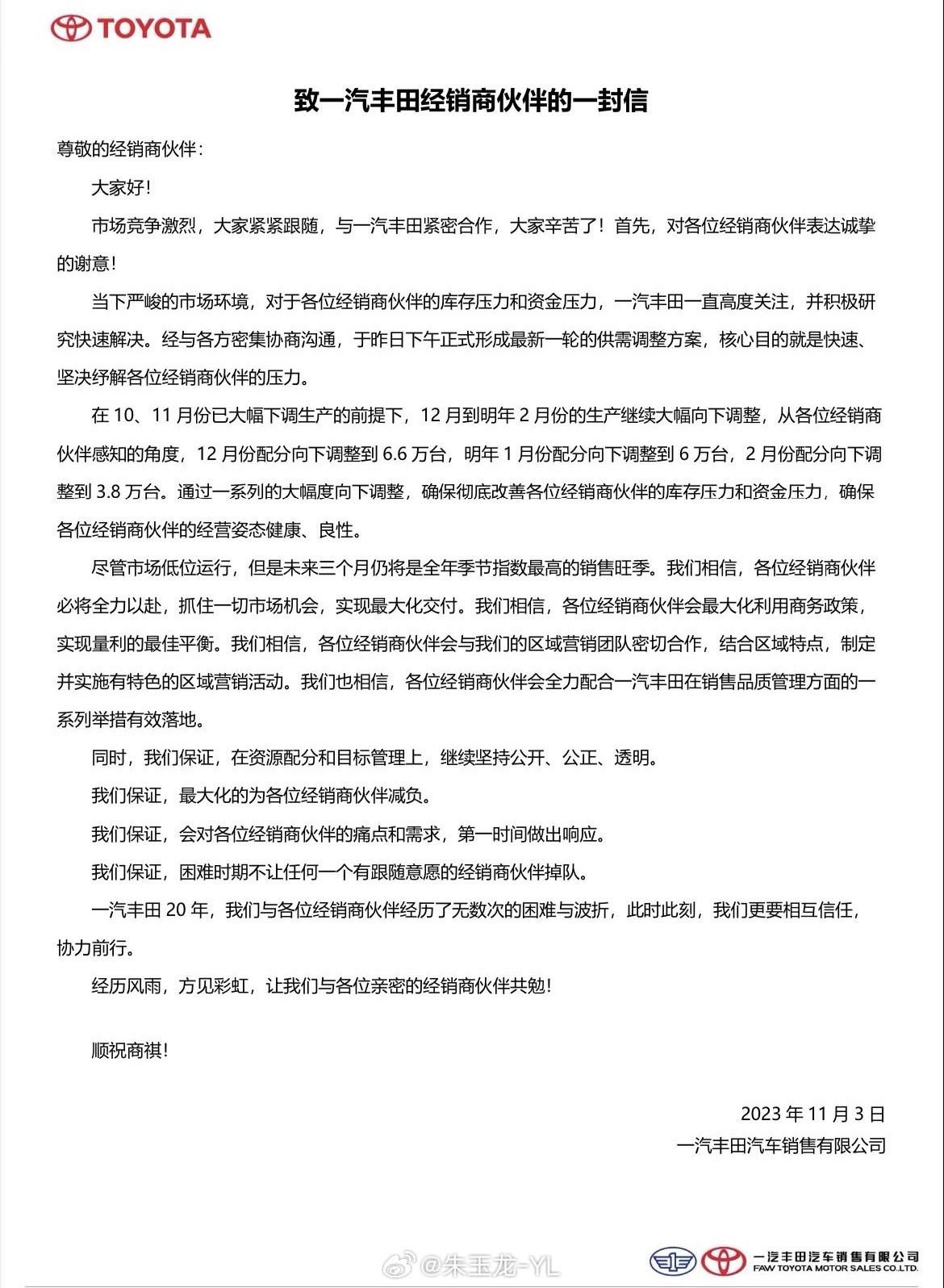 在自主品牌汽车价格战疯狂的攻势下,老牌合资市场份额不断被蚕食,这不,就连一汽丰田也有点吃不消了。近日,一汽丰田发布了致经销商伙伴的一份信,提到将通过减产的方式帮助经销商缓解库存和资金压力,以下为具体内容: