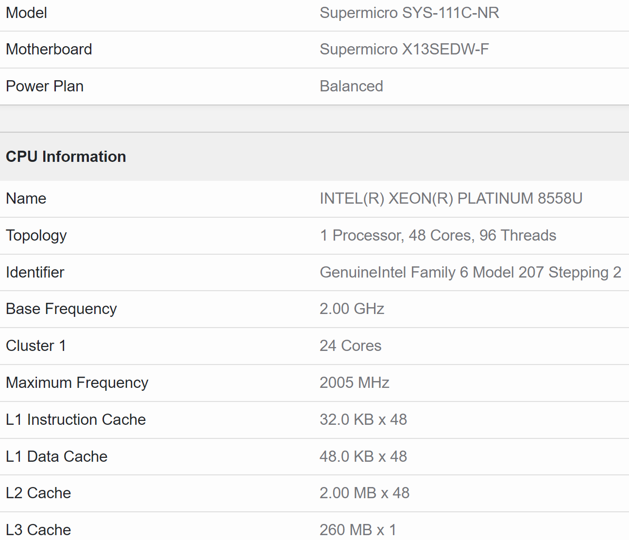 GeekBench里还出现了一款48核心96线程型号至强8558U,三级缓存260MB,主频2.0-4.0GHz,热设计功耗300W。