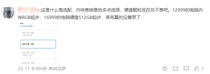 “内存贵倒是给多点选择,硬盘颗粒现在总不贵吧。12999的电脑内存8GB起步,16999的电脑硬盘512GB起步,库克真的没意思了。”