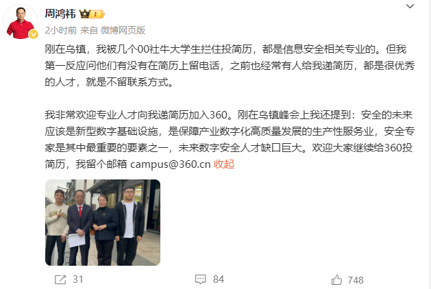 2023年世界互联网大会乌镇峰会今日在浙江乌镇开幕,众多互联网大佬参加此次峰会。今日,#大学生偶遇周鸿祎当场投简历#话题登上微博热搜,引来众网友围观。360集团创始人周鸿祎发文称,“刚在乌镇,我被几个00社牛大学生拦住投简历,都是信息安全相关专业的,但我第一反应问他们有没有在简历上留电话”。