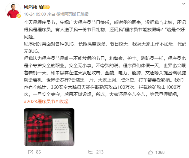 值得一提的是,在今年10月24日“程序员节”,周鸿祎谈到了“程序员能不能放假”的问题。