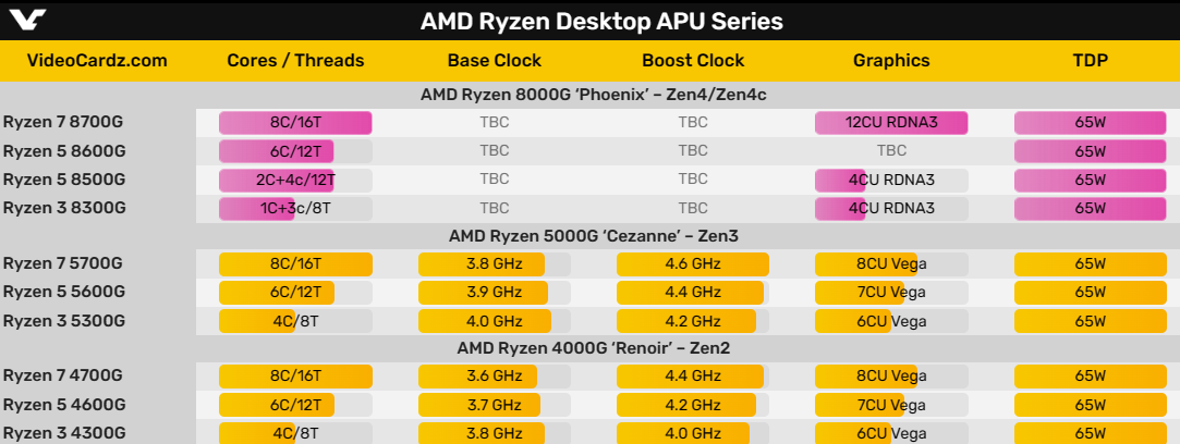 目前已知四款型号,分别是锐龙3 8300G、锐龙5 8500G、锐龙5 8600G、锐龙7 8700G,同时还有面向商用的PRO版本。