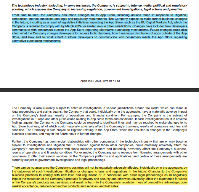 最后,苹果指出,如果苹果从App Store中获得的佣金减少,公司业务、经营业绩和财务状况可能会受到重大不利影响。