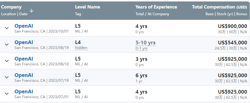 随着ChatGPT的爆火,OpenAI公司也成为了外界关注的焦点。根据美国薪资跟踪网站的数据显示,目前OpenAI软件工程师的中位数年薪高达92.5万美元(约合674万元人民币),包含了30万美元的基本工资和62.5万美元的利润参与单位(PPU)。