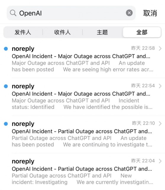 大概从北京时间11月8日21点54分开始,OpenAI的ChatGPT和API(提供给开发者搭建第三方服务的应用程序接口)全都无法使用,整个故障的时间大致持续了100分钟。