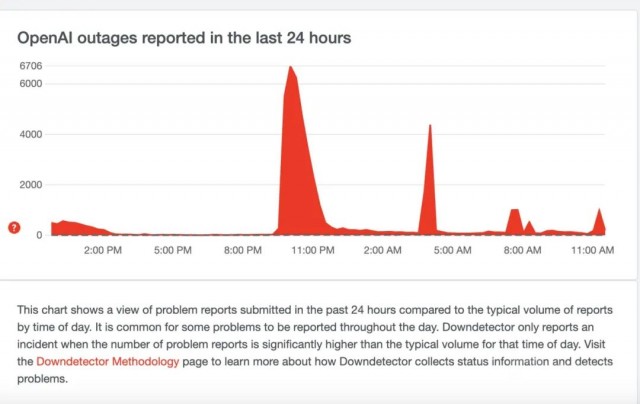 ChatGPT全线宕机“大崩溃”。北京时间昨夜今晨,AI聊天机器人产品ChatGPT和其API接口出现“严重停机”(Major Outage)事件,整个故障时间陆陆续续长达超过12小时。据网络状况监测平台Downdector显示,北京时间今天上午9时40分左右,ChatGPT和API又出现了周期性中断。