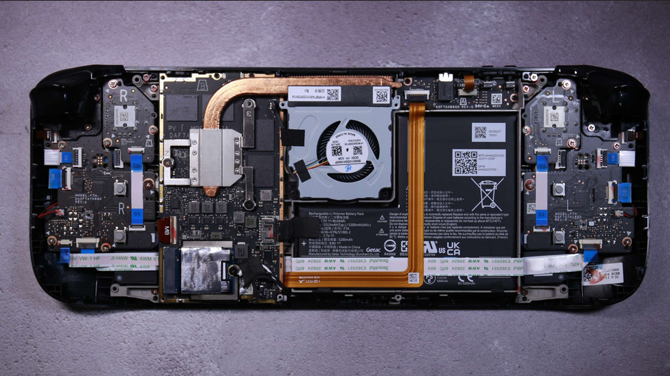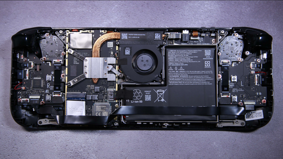 Steam DeckOLED 不仅仅是升级了一个屏幕,内部也发生了许多变化。V社称他们借此机会打造了“权威的新一代Steam Deck”,利用更薄的屏幕调整了手持设备的内部结构。因为 OLED 不需要 LED 背光板,使得 V社能够添加更厚的50Wh 电池、更大/更安静的冷却风扇以及改进的导热管和散热交换器。