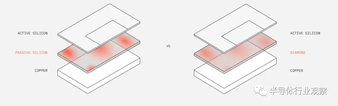 据DF描述,钻石晶圆在芯片内的高工作负荷晶体管的原子级距离内提供一个热量超高速通道,按照理想散热的情况分析,能使人工智能和云计算领域的硅芯片速度提升3倍。按照他们所剖出的原理图,他们将原本被动硅的部分替换成为钻石,使用钻石基板作为热导层,在晶体管工作产生热量时,热量可以更快速、更有效率地从活跃硅层传递到铜层并散发出去。