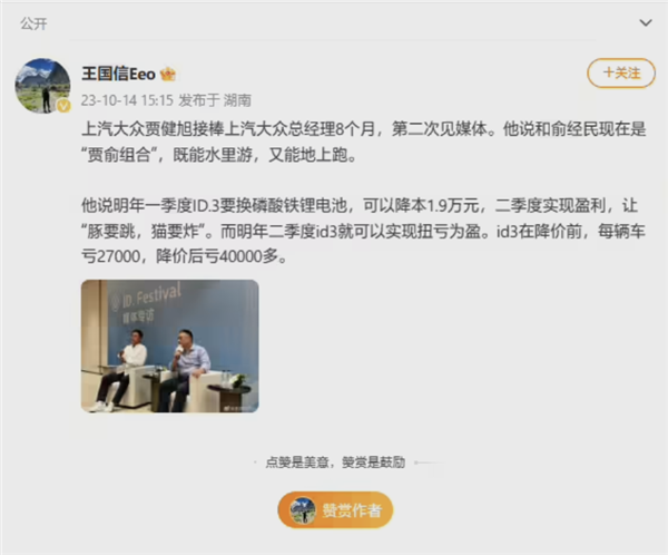 据该博主表示:目前,大众ID.3仍处于亏损状态,降价前,每卖出一台车将亏损2.7万元,降价后每辆车的亏损超过了4万元。