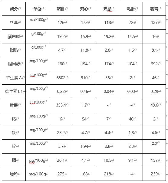 动物内脏富含优质蛋白质,含量与瘦肉不相上下。另外,维生素和微量元素含量突出,在各类食物中名列前茅。