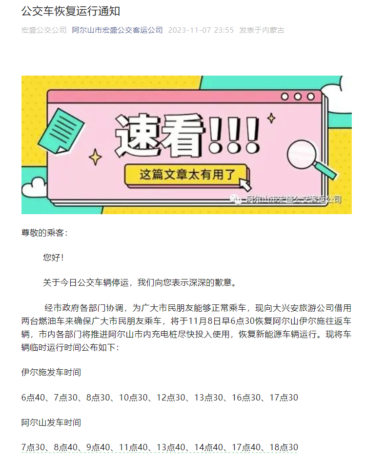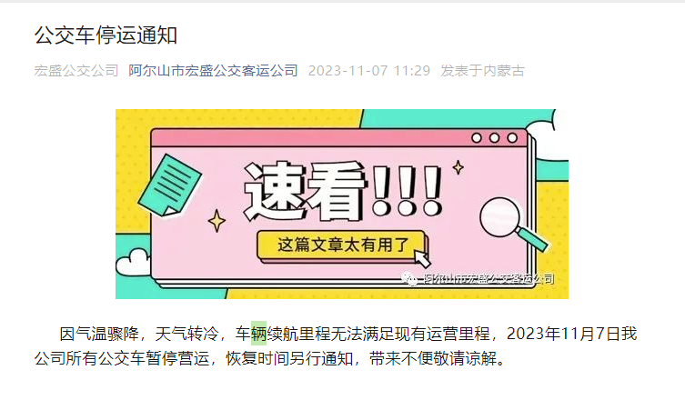 因气温骤降,天气转冷,车辆续航里程无法满足现有运营里程,2023年11月7日我公司所有公交车暂停营运,恢复时间另行通知,带来不便敬请谅解。