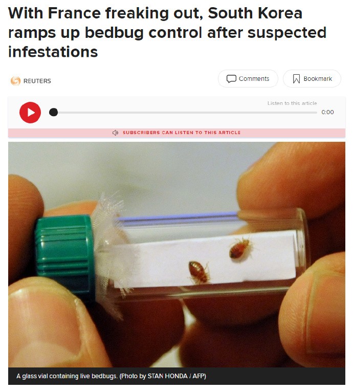 10月中旬,一位韩国博主称在该国中西部仁川市一家桑拿房中发现臭虫,此后,位于韩国东南部大邱的一所私立大学宿舍中也发现臭虫出没,校方怀疑这些臭虫是暑假期间来韩的外国交换生带入的。据悉,发现臭虫的床铺之前由英国学生使用。随后,臭虫危机扩展到首尔,截至10月底,首尔市25个区中共有18个区出现臭虫。