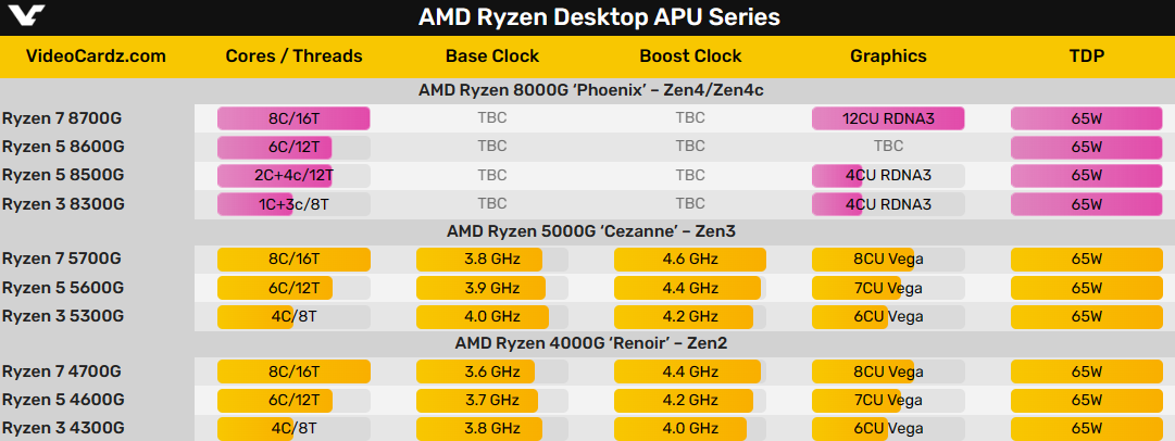 锐龙8000G系列目前已知有至少四款型号,其中锐龙7 8700G、锐龙5 8600G都是纯Zen4大核架构,分别8核心16线程、6核心12线程,集成最多12个RDNA3 CU单元。