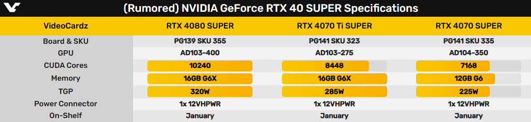 RTX 40 SUPER系列传闻了一段时间之后,终于有了极为靠谱的规格曝料,因为NVIDIA已经向品牌伙伴提供了相关信息,并迅速流传出来。