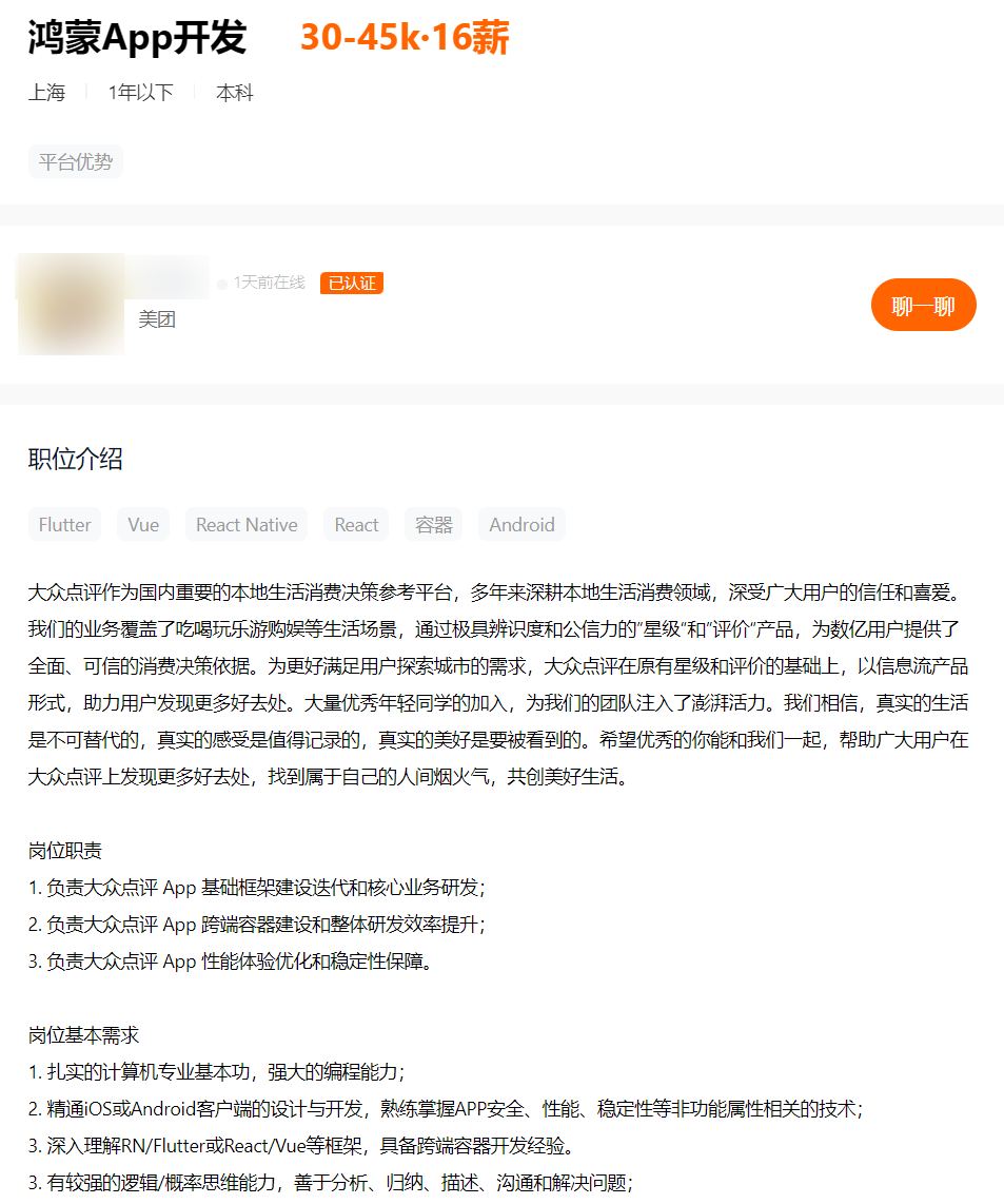 招聘网站显示,除了华为之外,已有凤凰、美团等多家互联网公司招聘鸿蒙开发岗位,其中,美团已经开除了30-45k、16薪的待遇,要求应聘者对鸿蒙系统深入了解,且有鸿蒙APP开发经验。