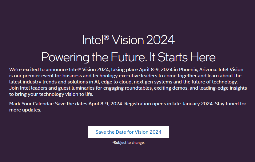 Intel官方宣布,将于当地时间2024年4月8-9日,在美国亚利桑那州凤凰城举办新一届Vision 2024大会。Intel Vision大会已经举办多次,一般不会用来正式发布某款产品,而是更多地关注行业趋势、公司项目进展等,但也会介绍一些新产品的进度或者成绩。