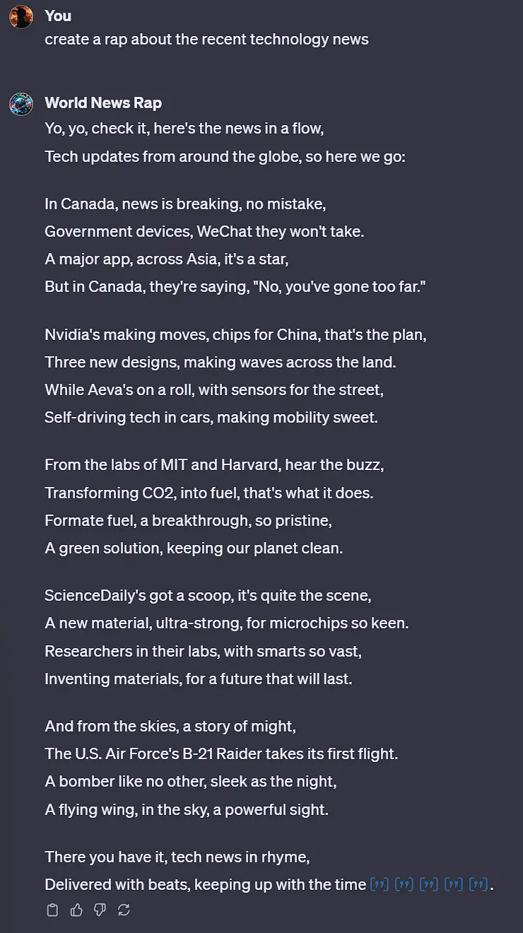 让它用这两天发生的科技新闻写段 Rap 词,不仅分分钟就能写出来,就连韵也押得贼溜。