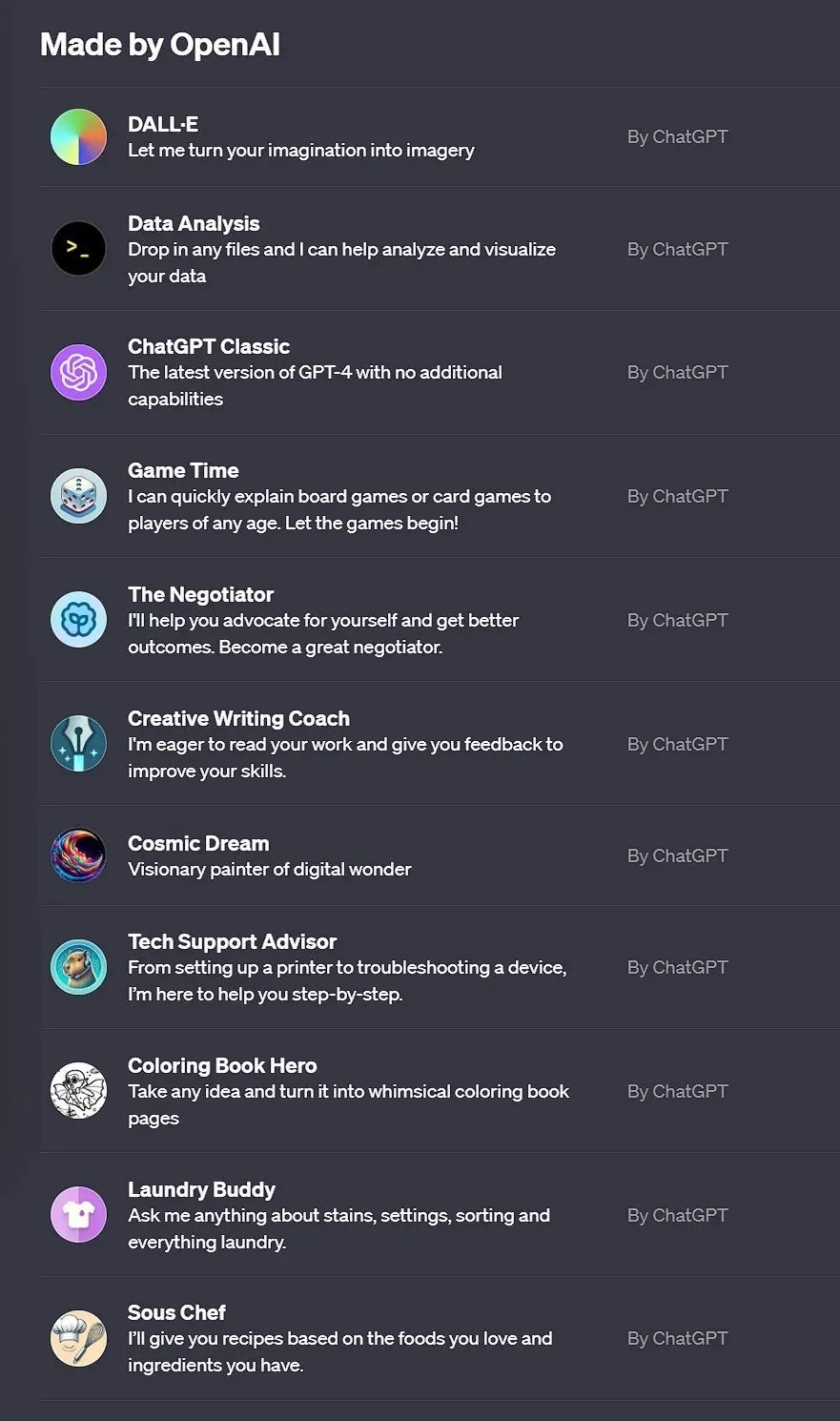 在 OpenAI 的官网上,目前由官方推出的 GPTs 只有 16 个,像大伙儿比较熟悉的 DALL-E ,还有什么数学导师、游戏时间、谈判者、洗衣伙伴... 算是官方亲自下场给大家打了个样儿。
