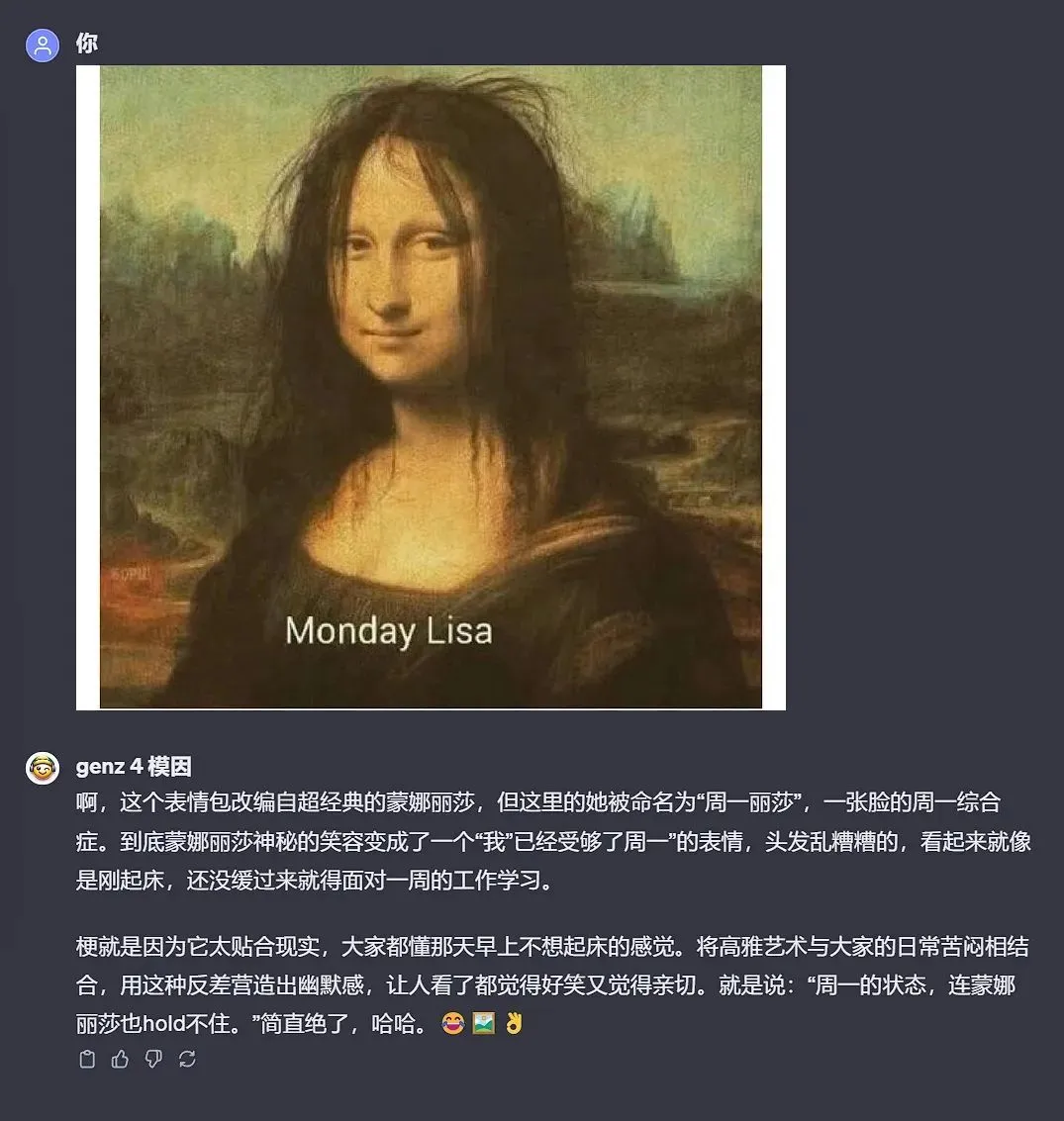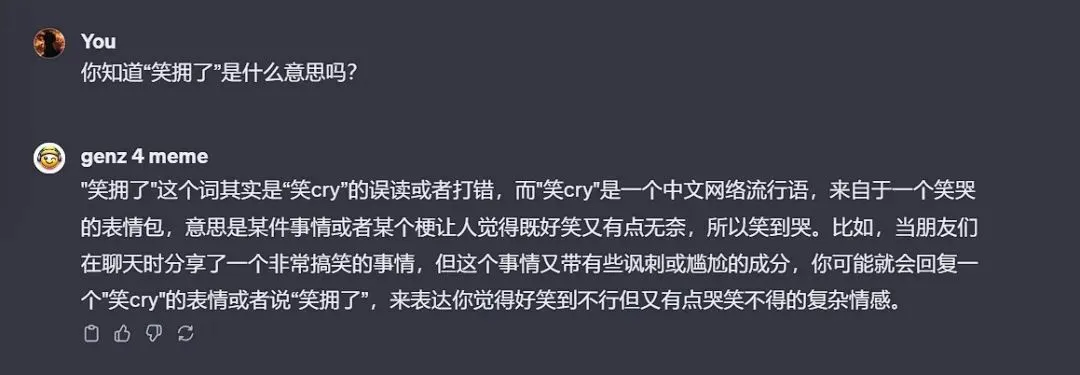 接着,我们又尝试了一个 genz 4 模因解释器,根据官方的介绍,这个 GPT 可以解释一些网络热梗和表情包。