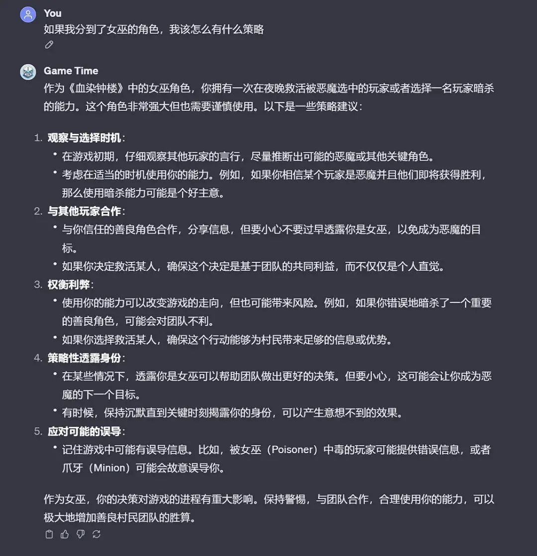 具体问它,如果抽到了女巫的角色应该怎么玩儿,说得也是有条有理。