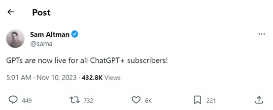 不知道大伙儿还记得上周 OpenAI 开发者大会上,奥特曼说的 GPTs 不。因为不需要会写代码,只要会打字,你就能基于 GPT-4 ,创建并上线各种 GPT 应用。所以不少人都说, GPTs 断了不少 AI 应用初创公司的生路。本来,说是本月底正式上线的,结果前脚大会刚结束,奥特曼后脚就在社媒上官宣:GPTs 上线啦!